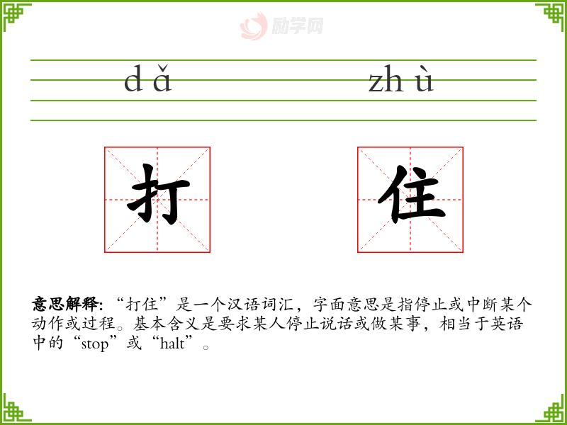 “打住”是一个汉语词汇,字面意思是指停止或中断某个动作或过程。基本含义是要求某人停止说话或做某事,相当于英语中的“stop”或“halt”。
