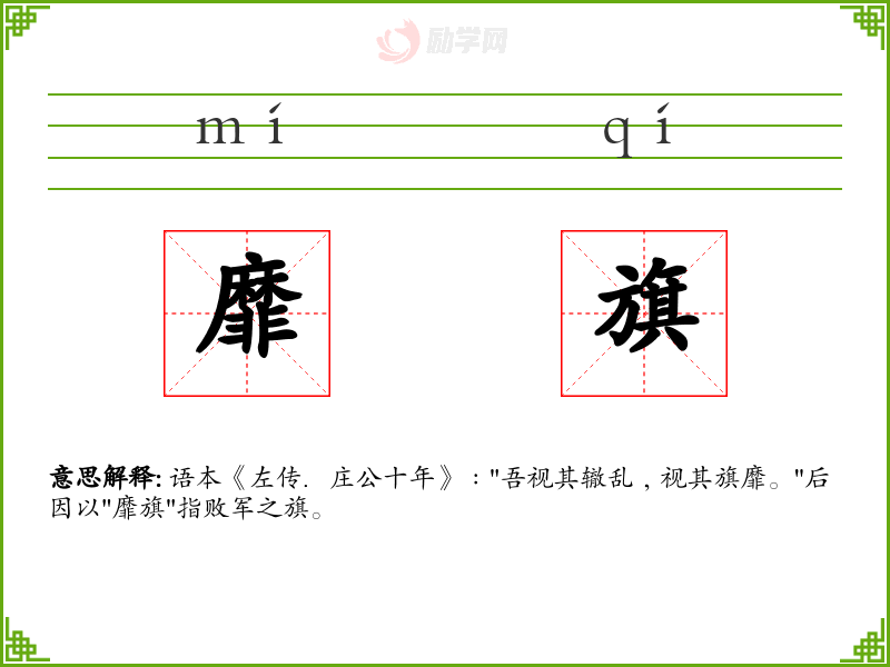 靡旗的意思是:语本《左传.庄公十年》﹕"吾视其辙乱﹐视其旗靡。"后因以"靡旗"指败军之旗。