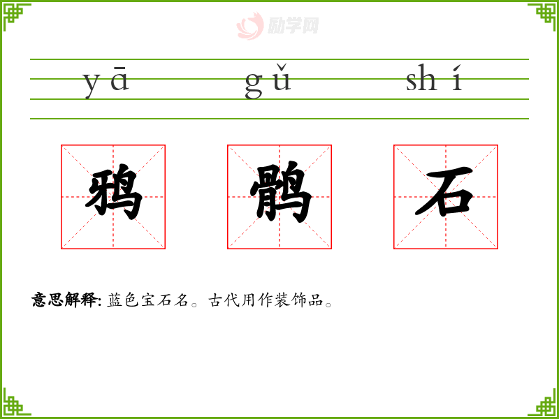 鸦鹘石的意思是:蓝色宝石名。古代用作装饰品。