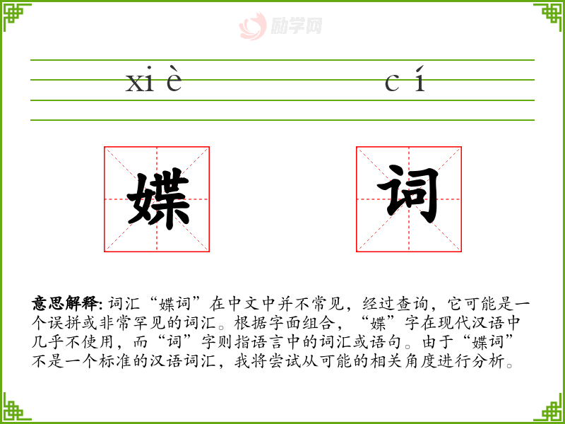 由于“媟词”不是一个标准词汇,我们无法给出确切的基本定义。如果“媟”字来源于古汉语,它可能与不正当或不雅的行为有关,那么“媟词”可能指的是不雅或不当的言辞。