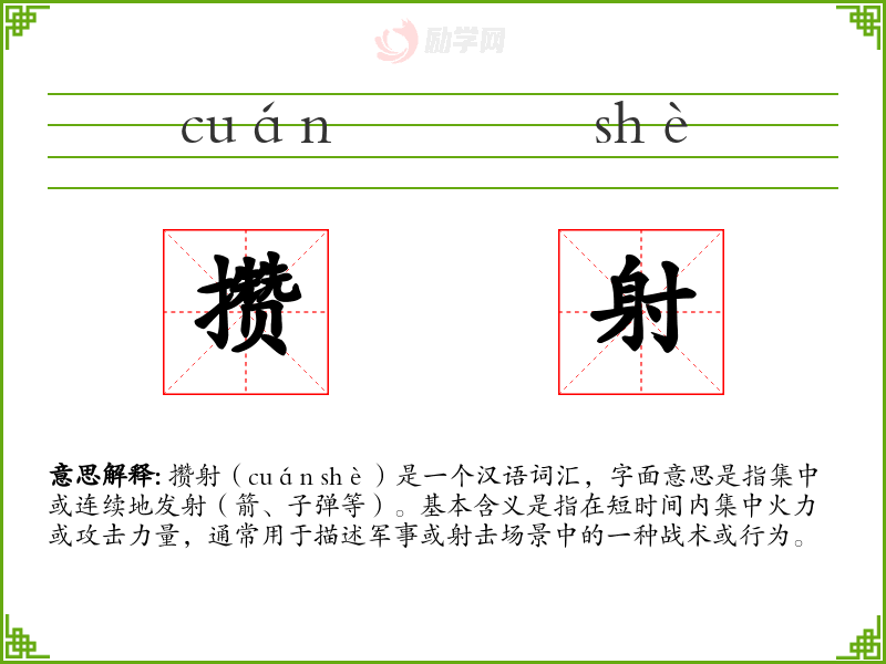 攒射是一个具有特定军事和射击背景的词汇,但在更广泛的意义上,它可以代表集中力量以达到目标的概念。在语言学习和表达中,理解这样的词汇有助于丰富我们的词汇量和表达能力。