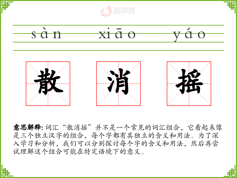 词汇“散消摇”并不是一个常见的词汇组合,它看起来像是三个独立汉字的组合,每个字都有其独立的含义和用法。为了深入学习和分析,我们可以分别探讨每个字的含义和用法,然后再尝试理解这个组合可能在特定语境下的意义。