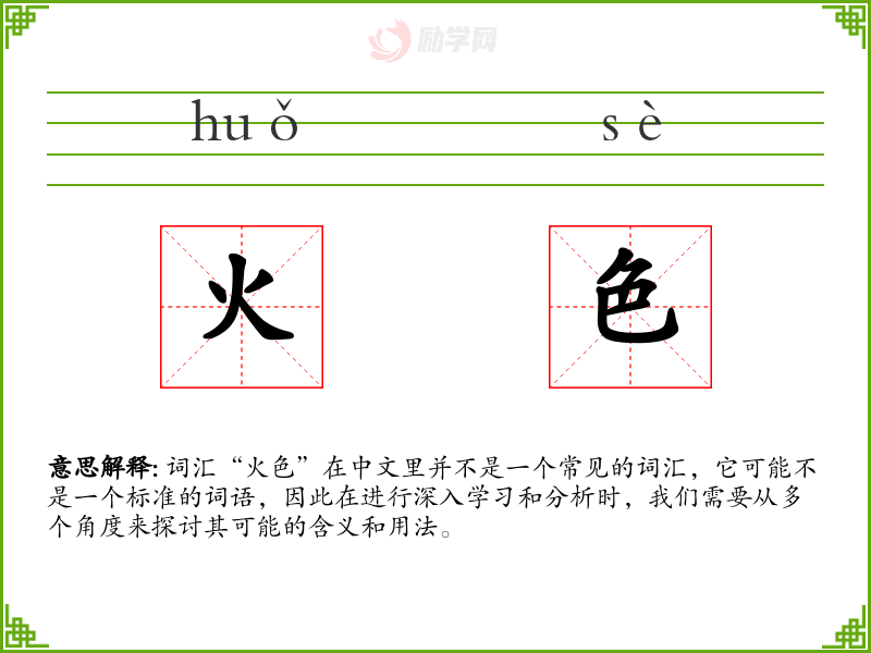 词汇“火色”在中文里并不是一个常见的词汇,它可能不是一个标准的词语,因此在进行深入学*和分析时,我们需要从多个角度来探讨其可能的含义和用法。