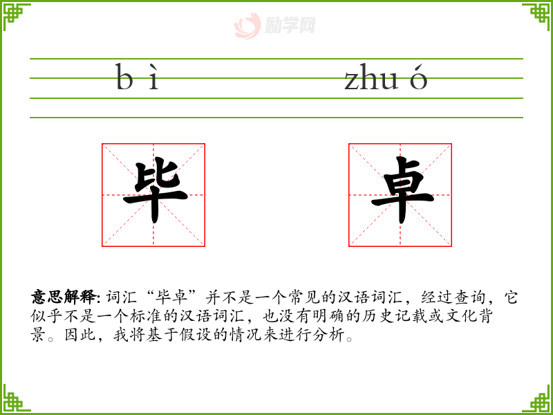 词汇“毕卓”并不是一个常见的汉语词汇,经过查询,它似乎不是一个标准的汉语词汇,也没有明确的历史记载或文化背景。因此,我将基于假设的情况来进行分析。