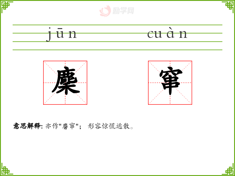 麇窜的意思是:亦作"麏窜"; 形容惊慌逃散。