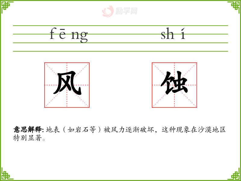 风蚀的意思是:地表(如岩石等)被风力逐渐破坏,这种现象在沙漠地区特别显著。