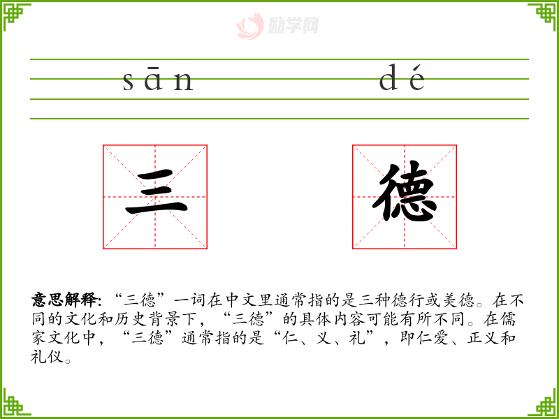 “三德”这个词通常带有一种积极、正面的情感反应,让人联想到高尚的道德品质和理想的人格。它鼓励人们追求更高的道德标准,并在日常生活中实践这些美德。