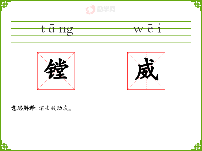 镗威的意思是:谓击鼓助威。
