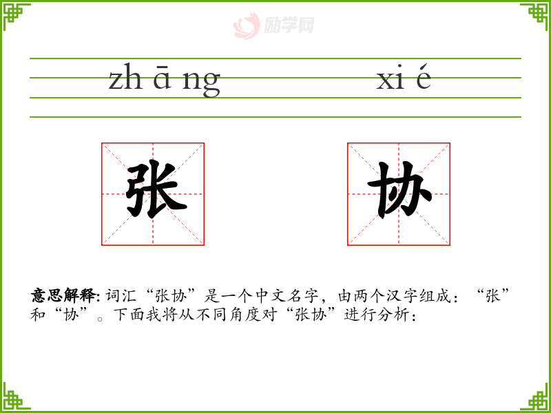 - 张:在中文中,“张”是一个常见的姓氏,源自古代的官职名称,也有展开、扩张的含义。