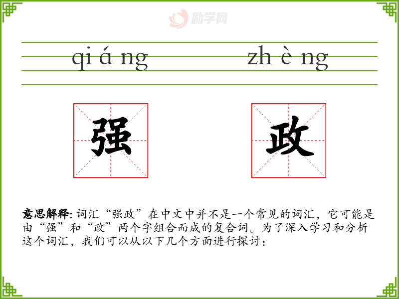 词汇“强政”在中文中并不是一个常见的词汇,它可能是由“强”和“政”两个字组合而成的复合词。为了深入学习和分析这个词汇,我们可以从以下几个方面进行探讨: