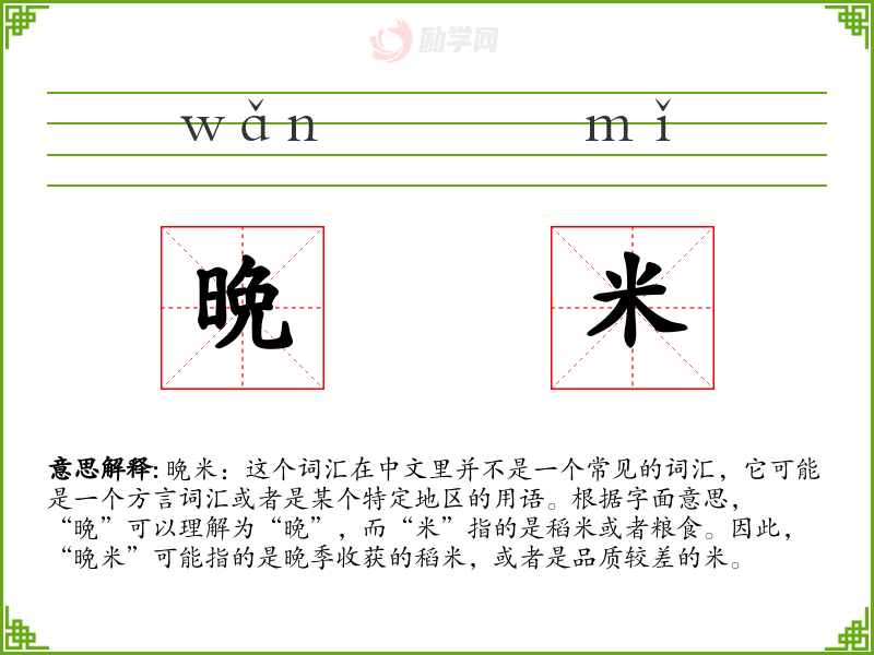 由于“晩米”不是一个标准汉语词汇,它在不同语境下的使用可能非常有限。在方言或特定地区的口语中,它可能用来指代晚季收获的稻米,这种米可能在口感、营养价值上与早季收获的稻米有所不同。