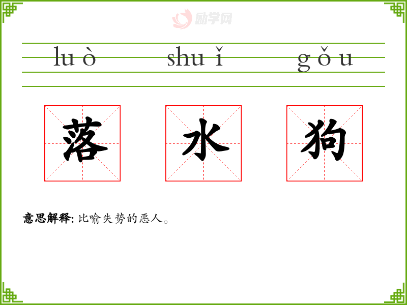 《说文》-水,准也。 《释名》-水,准也。准,平也。天下莫平于水。 《淮南子·天文》-积阴之寒气为水。 《书·洪范》-五行一曰水。 《左传·桓公元年》-凡平原出水为大水。 《礼记·曲礼》-水曰清滌。 《荀子·劝学》-冰,水为之,而寒于水。 宋·司马光《资治通鉴》-刘豫州王室之胄,英才盖世,众士慕仰,若水之归海。