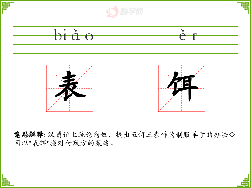 表饵的意思是:汉贾谊上疏论匈奴,提出五饵三表作为制服单于的办法◇因以"表饵"指对付敌方的策略。