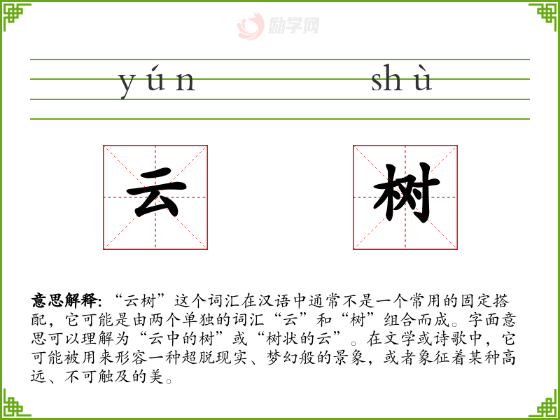 “云树”这个词汇在汉语中虽然不是一个常用词汇,但它具有丰富的文学和艺术潜力,能够激发人们的想象力和创造力。在语言学*和表达中,理解和运用这样的词汇可以丰富我们的语言表达,增添文学和艺术的魅力。