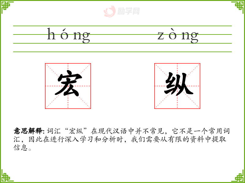 词汇“宏纵”在现代汉语中并不常见,它不是一个常用词汇,因此在进行深入学习和分析时,我们需要从有限的资料中提取信息。