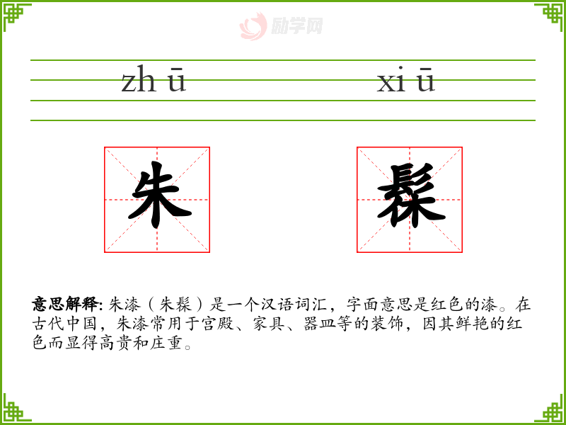 朱漆作为一个词汇,不仅代表了古代*的工艺技术,也承载了丰富的文化意义。在学这个词汇的过程中,我更加深刻地理解了颜色在文化中的重要性,以及它在语言表达中的多样性。