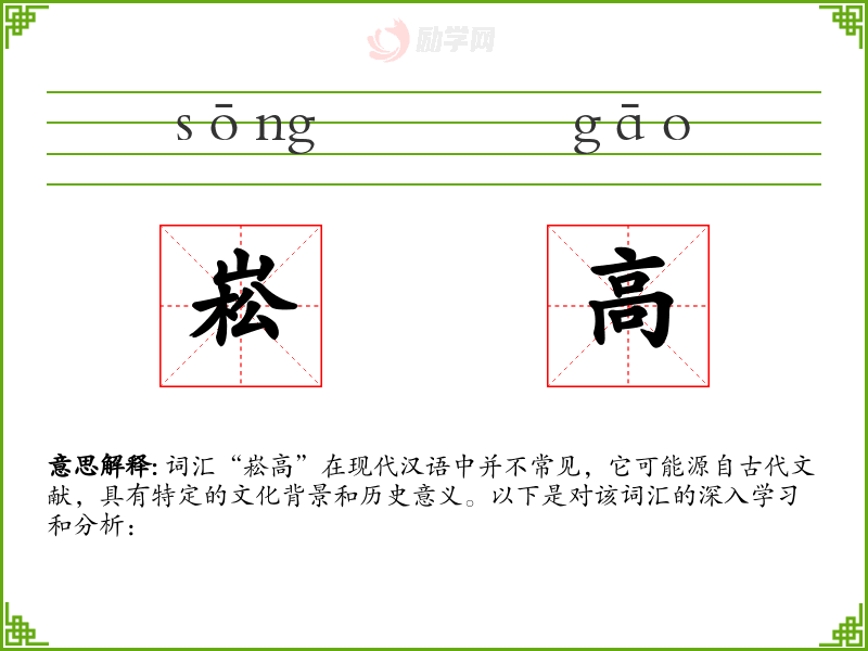 “崧”字在古代汉语中意为高大的山,而“高”字则表示高度。这两个字组合在一起,强调了山的高大和雄伟。随着时间的推移,“崧高”这一词汇在现代汉语中较少使用,但其文化内涵和历史意义仍然被保留。