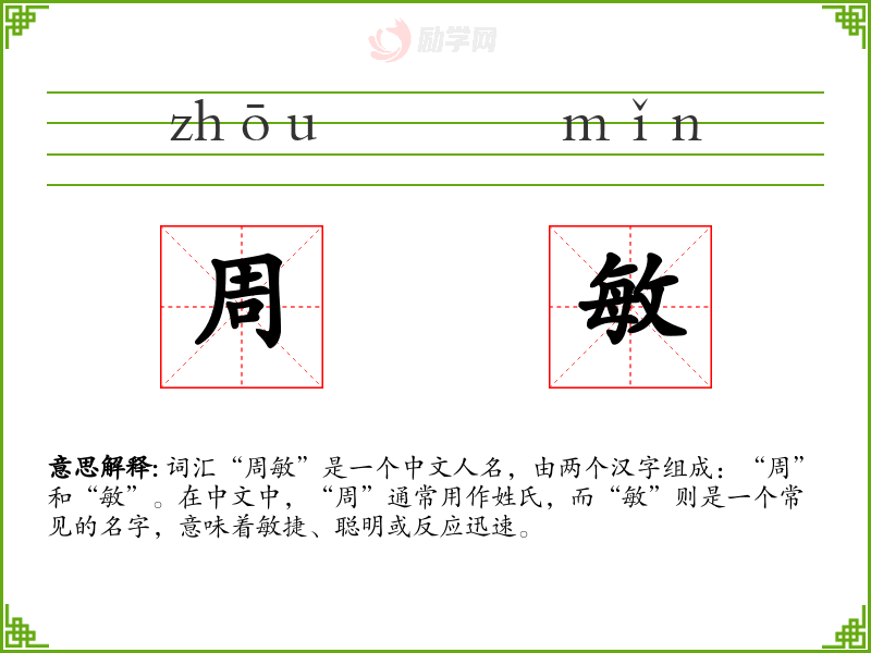 - 理解:“周敏”作为一个名字,在中文中具有积极的含义,代表着聪明和敏捷。