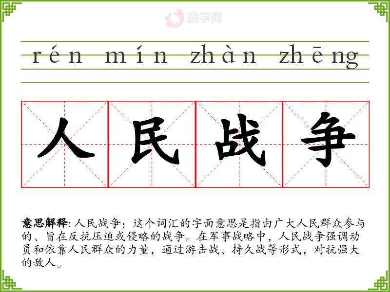 人民战争:这个词汇的字面意思是指由广大人民群众参与的、旨在反抗压迫或侵略的战争。在军事战略中,人民战争强调动员和依靠人民群众的力量,通过游击战、持久战等形式,对抗强大的敌人。