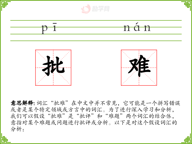词汇“批难”在中文中并不常见,它可能是一个拼写错误或者是某个特定领域或方言中的词汇。为了进行深入学习和分析,我们可以假设“批难”是“批评”和“难题”两个词汇的结合体,意指对某个难题或问题进行批评或分析。以下是对这个假设词汇的分析: