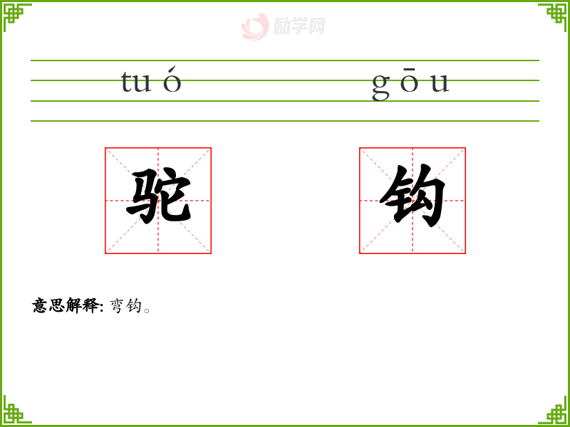 《说文》。韵会引作“曲鉤也。”-鉤,曲也。 《玉篇》-鉤,曲也,所以鉤悬物也。 《周礼·春官·巾车》-金路鉤。 《国语·晋语》。注:“带鉤也。”-申孙之矢,集于桓鉤。 《孟子》-岂谓一鉤金。 《庄子·胠箧》-窃鉤者诛。 《诗·大雅·皇矣》。传:“鉤梯也,所以引上城者。”-以尔鉤援。 《汉书·韩延寿传》。注:“兵器也。”-作刀剑鉤鐔。