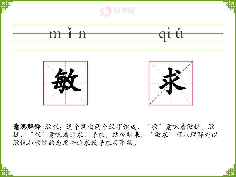 “敏求”这个词对我来说,代表了积极的学态度和对知识的渴望。在语言学和表达中,它提醒我要保持敏锐和敏捷,不断追求进步和卓越。