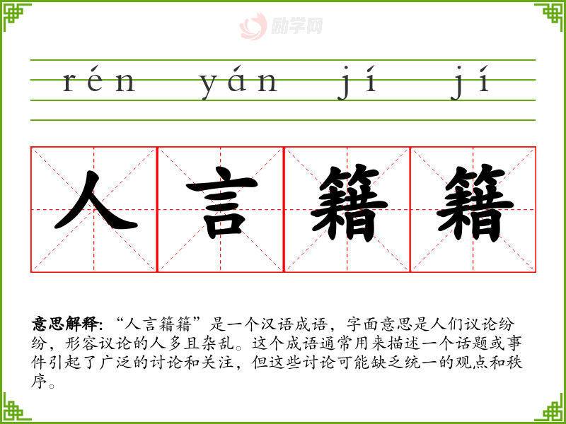 “人言籍籍”这个成语在描述社会现象时非常有用,它不仅传达了讨论的广泛性,还暗示了这种讨论的无序和复杂。在我的语言学*和表达中,理解和正确使用这个成语可以帮助我更准确地描述社会现象和舆论动态。