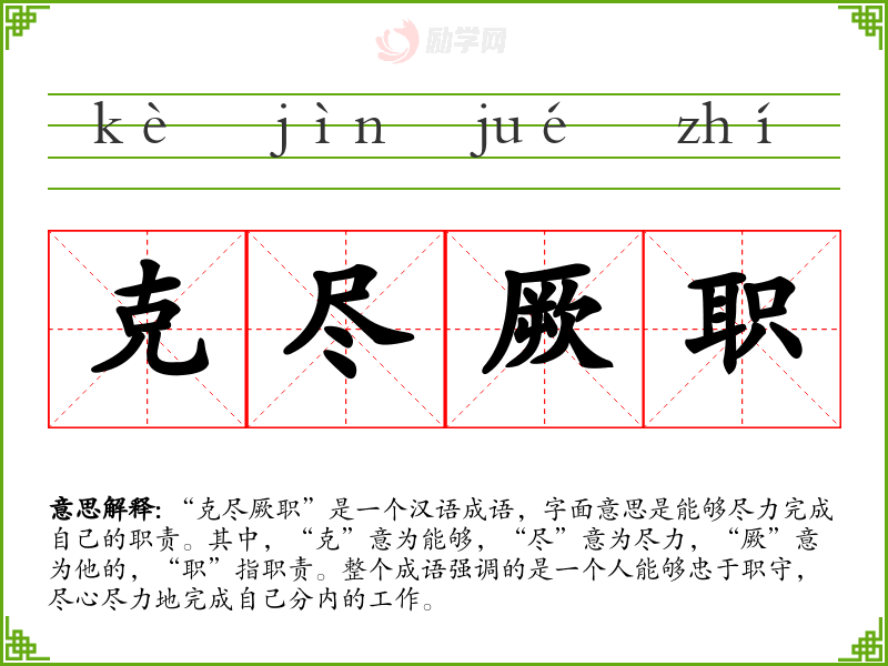 “克尽厥职”是一个汉语成语,字面意思是能够尽力完成自己的职责。其中,“克”意为能够,“尽”意为尽力,“厥”意为他的,“职”指职责。整个成语强调的是一个人能够忠于职守,尽心尽力地完成自己分内的工作。
