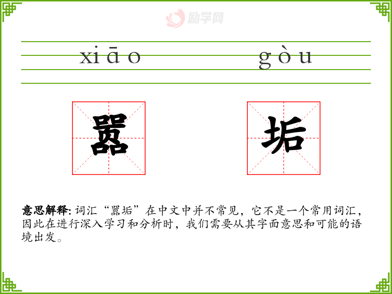 词汇“嚣垢”在中文中并不常见,它不是一个常用词汇,因此在进行深入学习和分析时,我们需要从其字面意思和可能的语境出发。