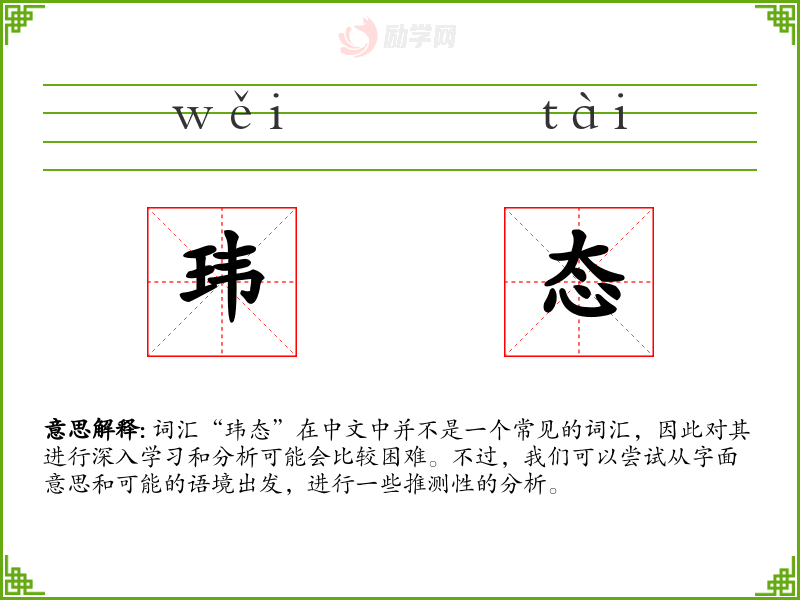 词汇“玮态”在中文中并不是一个常见的词汇,因此对其进行深入学习和分析可能会比较困难。不过,我们可以尝试从字面意思和可能的语境出发,进行一些推测性的分析。