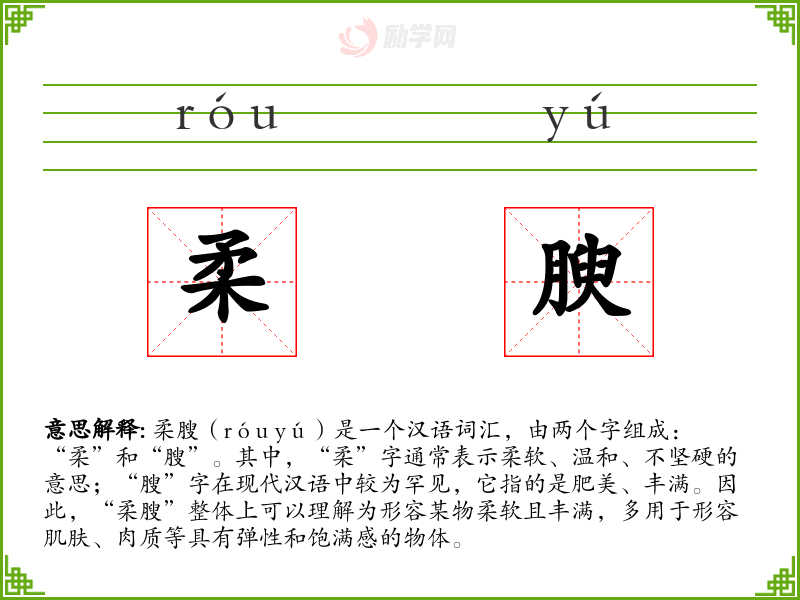 “柔膄”这个词汇虽然在现代汉语中不常见,但它承载了丰富的文化内涵和历史情感。了解和学*这样的词汇,不仅能够丰富我的语言知识,还能让我更好地理解和欣赏**传统文化中的美学和价值观。