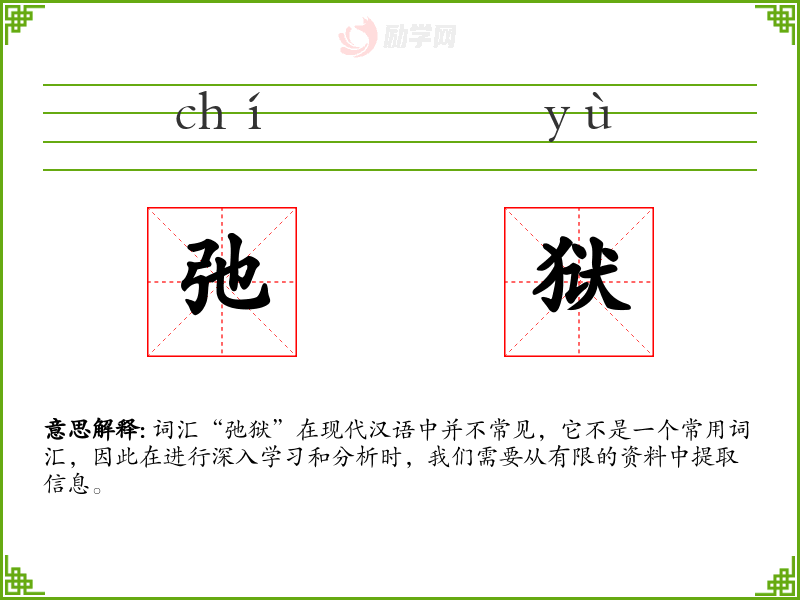 词汇“弛狱”在现代汉语中并不常见,它不是一个常用词汇,因此在进行深入学*和分析时,我们需要从有限的资料中提取信息。