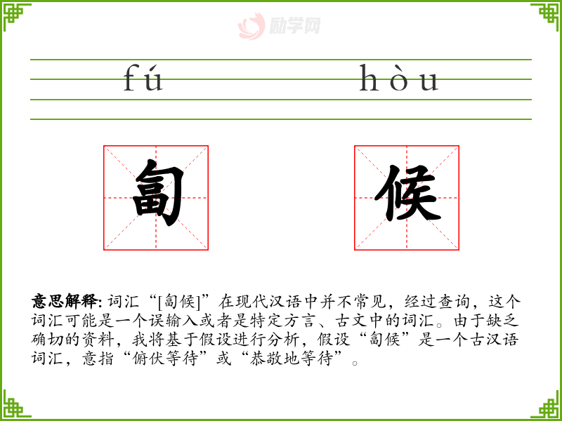 词汇“[匐候]”在现代汉语中并不常见,经过查询,这个词汇可能是一个误输入或者是特定方言、古文中的词汇。由于缺乏确切的资料,我将基于假设进行分析,假设“匐候”是一个古汉语词汇,意指“俯伏等待”或“恭敬地等待”。