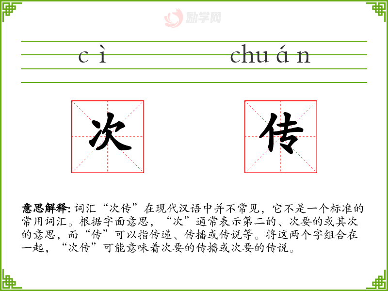 - 由于“次传”不是一个常用词汇,其词源和演变不太明确,可能是在特定语境下由“次”和“传”组合而成的新词。