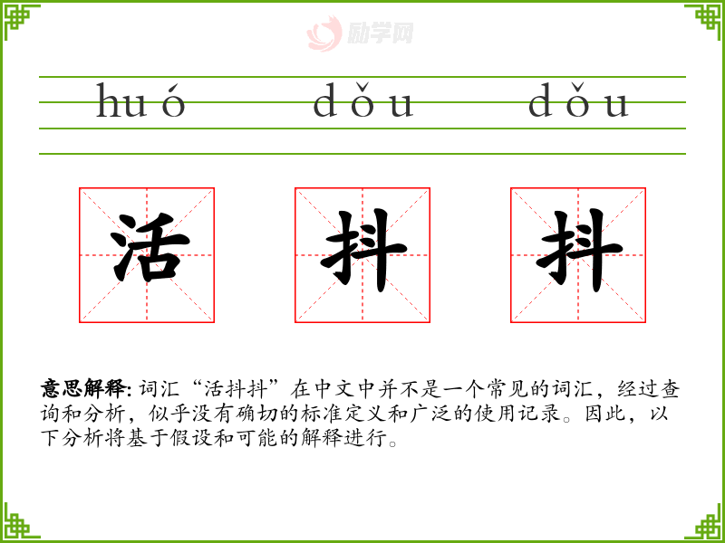 词汇“活抖抖”在中文中并不是一个常见的词汇,经过查询和分析,似乎没有确切的标准定义和广泛的使用记录。因此,以下分析将基于假设和可能的解释进行。