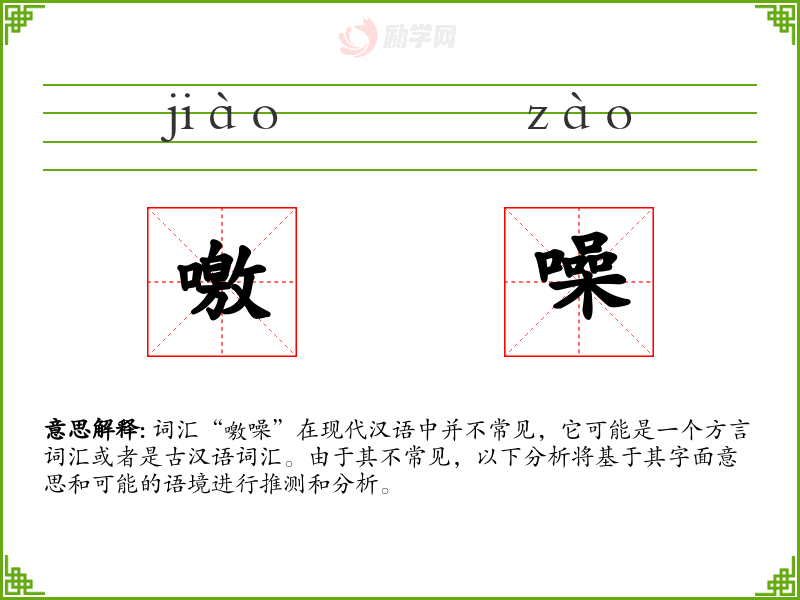 “噭噪”的字面意思可能与声音有关,其中“噭”可能指尖锐或响亮的声音,“噪”则通常指嘈杂的声音。结合起来,“噭噪”可能指的是尖锐或响亮的嘈杂声音。