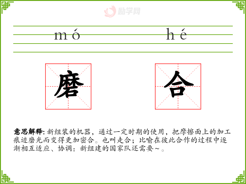 磨合的意思是:新组装的机器,通过一定时期的使用,把摩擦面上的加工痕迹磨光而变得更加密合。也叫走合;比喻在彼此合作的过程中逐渐相互适应、协调:新组建的国家队还需要~。