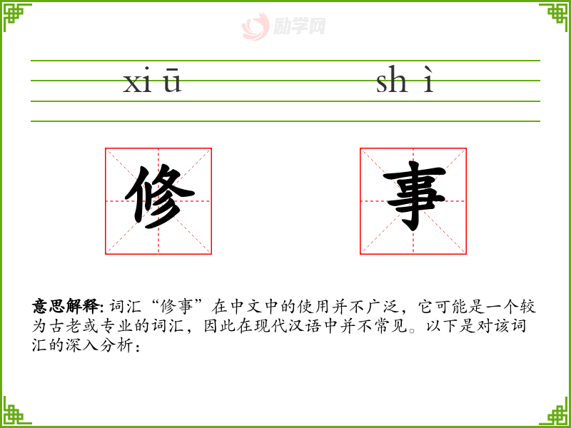 “修事”是一个具有历史和文化背景的词汇,虽然在现代汉语中不常见,但它反映了语言的演变和文化传承。在学*语言时,了解这样的词汇有助于更全面地理解语言的深度和广度。