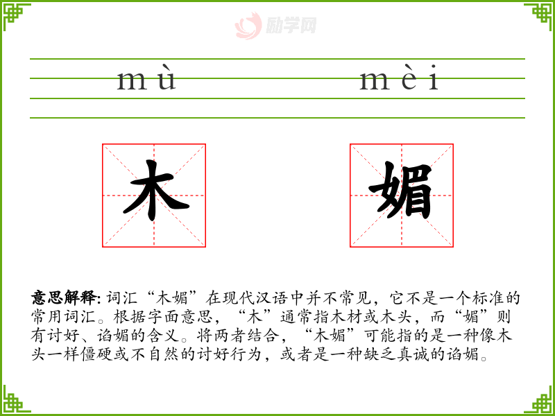 - 文学:可能在某些文学作品中用来形容人物的行为或态度,如“他的笑容显得木媚,让人感到不舒服。”