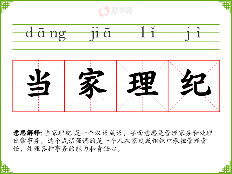 当家理纪 是一个汉语成语,字面意思是管理家务和处理日常事务。这个成语强调的是一个人在家庭或组织中承担管理责任,处理各种事务的能力和责任心。