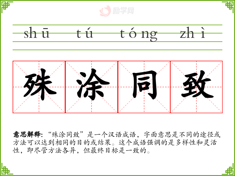 “殊涂同致”是一个富有哲理的成语,它不仅在语言表达中提供了丰富的内涵,也在实际生活和工作中提供了指导思想。通过学*和应用这个成语,我更加重视多样性和创新思维的重要性。