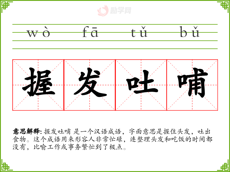 握发吐哺 是一个汉语成语,字面意思是握住头发,吐出食物。这个成语用来形容人非常忙碌,连整理头发和吃饭的时间都没有,比喻工作或事务繁忙到了极点。