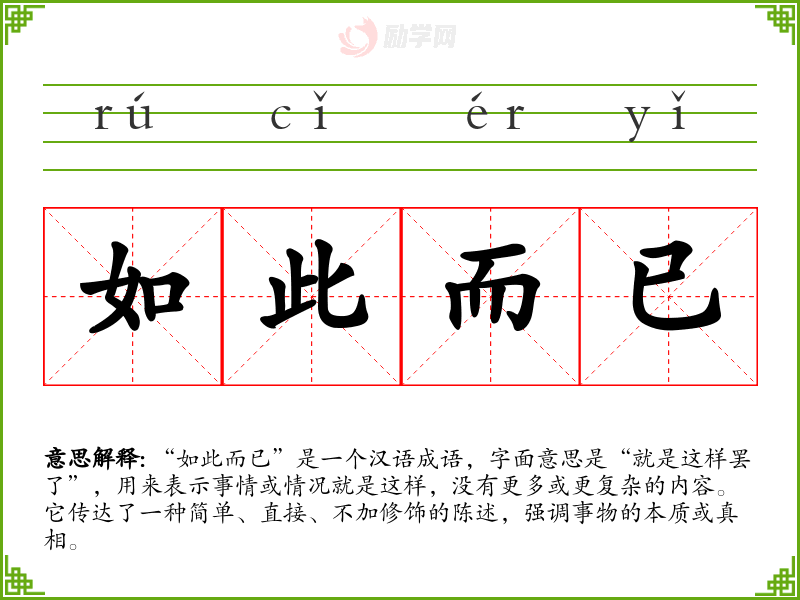 “如此而已”是一个汉语成语,字面意思是“就是这样罢了”,用来表示事情或情况就是这样,没有更多或更复杂的内容。它传达了一种简单、直接、不加修饰的陈述,强调事物的本质或真相。