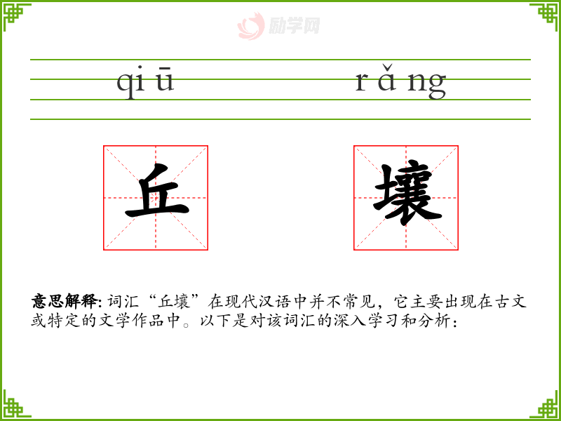 词汇“丘壤”在现代汉语中并不常见,它主要出现在古文或特定的文学作品中。以下是对该词汇的深入学*和分析: