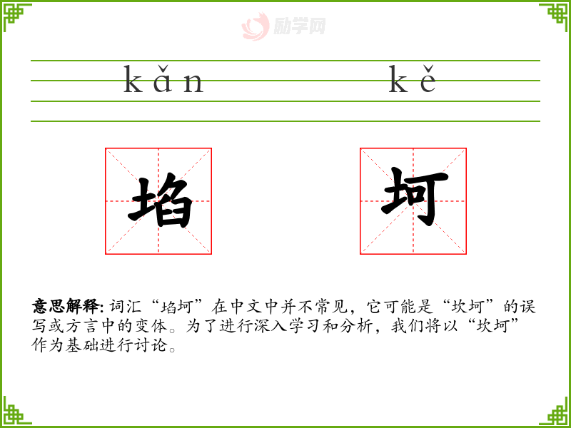 词汇“埳坷”在中文中并不常见,它可能是“坎坷”的误写或方言中的变体。为了进行深入学*和分析,我们将以“坎坷”作为基础进行讨论。