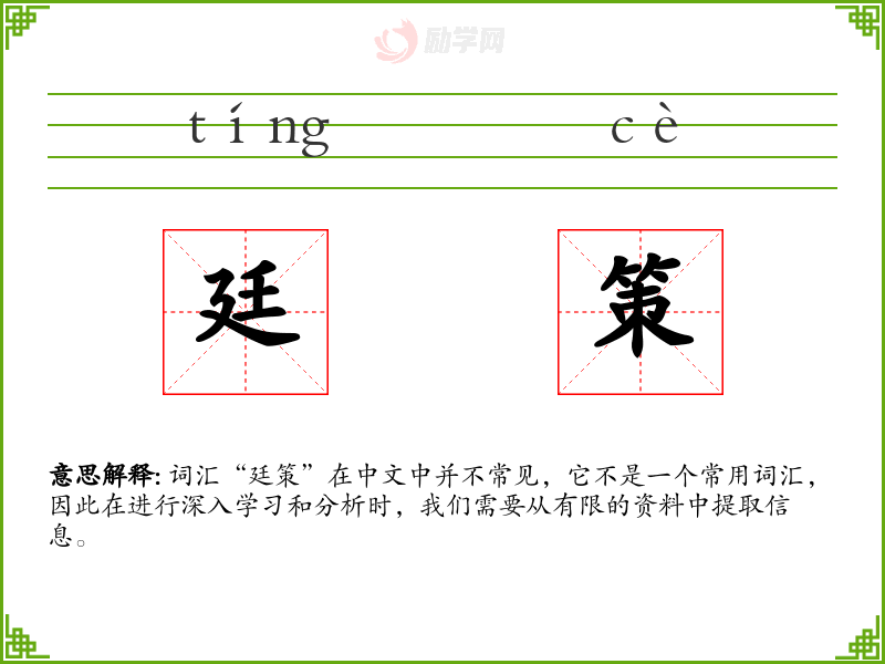 词汇“廷策”在中文中并不常见,它不是一个常用词汇,因此在进行深入学*和分析时,我们需要从有限的资料中提取信息。