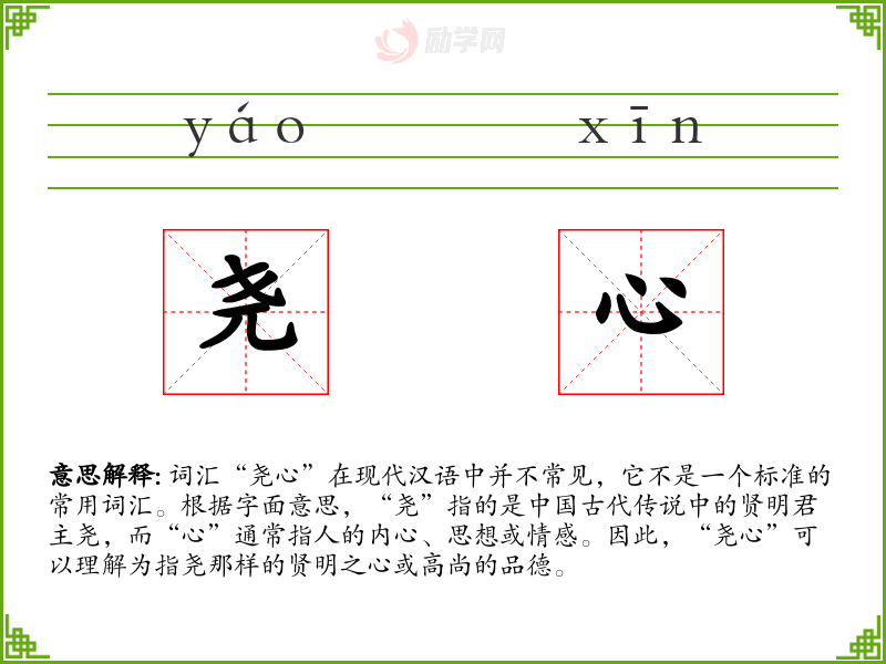 - 词源:“尧”源自中国古代传说中的君主尧,“心”是汉语中表示内心、思想的常用字。