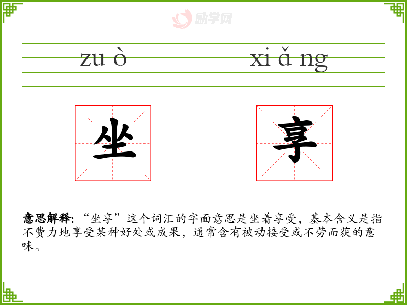“坐享”这个词汇可能带有一种消极的情感反应,因为它暗示了一种不公平和不劳而获的行为。在联想上,可能会想到那些不努力却获得好处的人,引发一种不满或嫉妒的情绪。