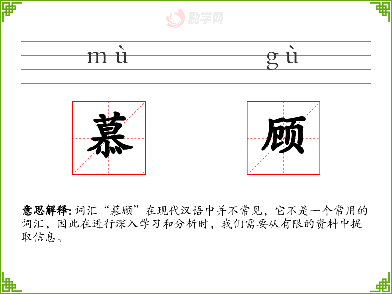 词汇“慕顾”在现代汉语中并不常见,它不是一个常用的词汇,因此在进行深入学习和分析时,我们需要从有限的资料中提取信息。