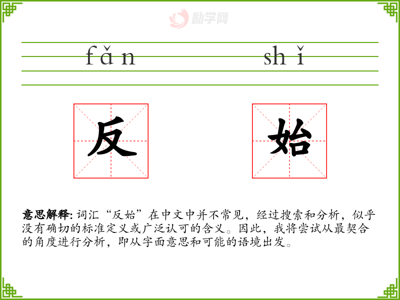 词汇“反始”在中文中并不常见,经过搜索和分析,似乎没有确切的标准定义或广泛认可的含义。因此,我将尝试从最契合的角度进行分析,即从字面意思和可能的语境出发。
